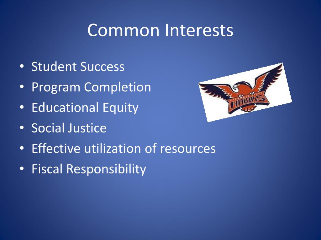 Common Interests • Student Success • Program Completion • Educational Equity • Social Justice • Effective utilization of resources • Fiscal Responsibility