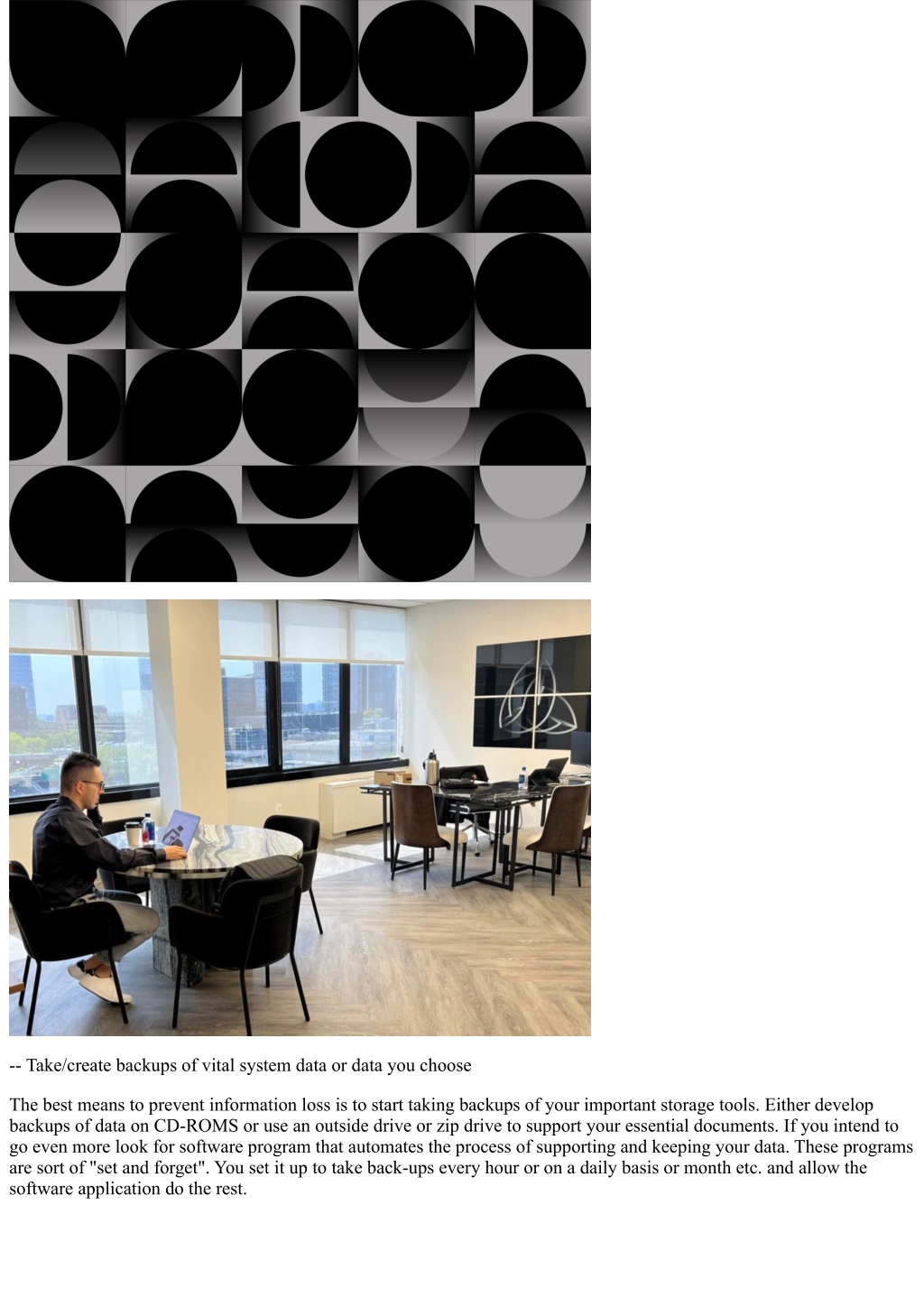 2. -- Take/create backups of vital system data or data you choose The best means to prevent information loss is to start taking backups of your important storage tools. Either develop backups of data on CD-ROMS or use an outside drive or zip drive to support your essential documents. If you intend to go even more look for software program that automates the process of supporting and keeping your data. These programs are sort of "set and forget". You set it up to take back-ups every hour or on a daily basis or month etc. and allow the software application do the rest.