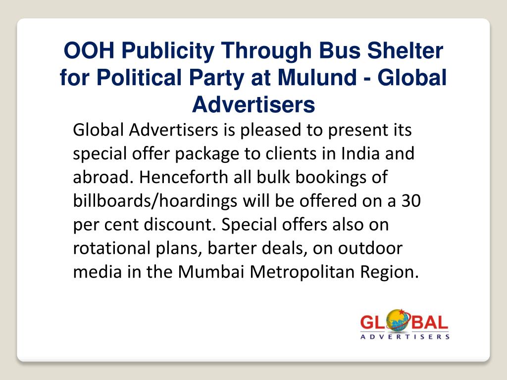 OOH Publicity Through Bus Shelter for Political Party at Mulund - Global Advertisers Global Advertisers is pleased to present its special offer package to clients in India and abroad. Henceforth all bulk bookings of billboards/hoardings will be offered on a 30 per cent discount. Special offers also on rotational plans, barter deals, on outdoor media in the Mumbai Metropolitan Region.