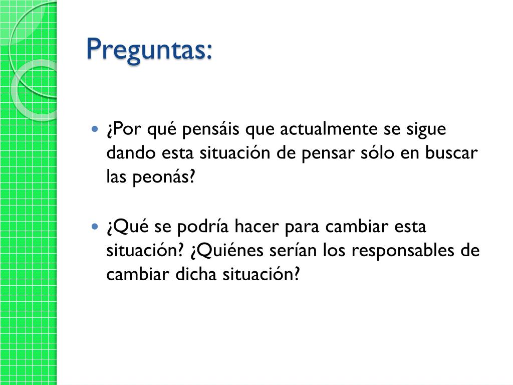 Preguntas: • ¿Por qué pensáis que actualmente se sigue dando esta situación de pensar sólo en buscar las peonás? • ¿Qué se podría hacer para cambiar esta situación? ¿Quiénes serían los responsables de cambiar dicha situación?