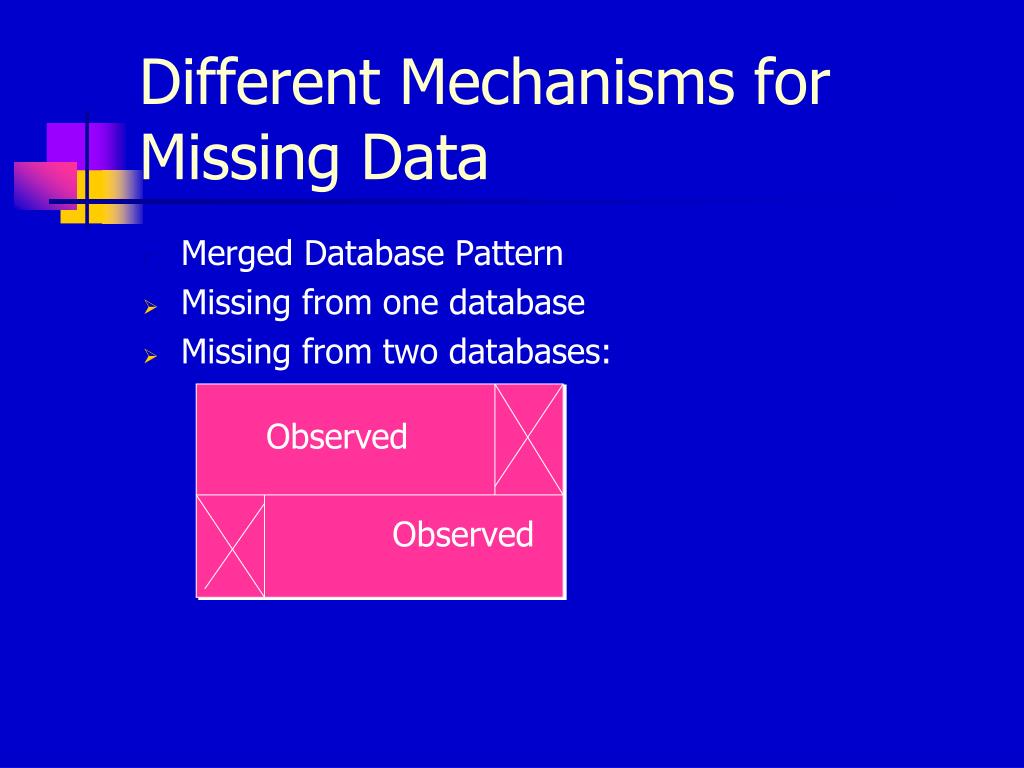 Different Mechanisms for Missing Data • Merged Database Pattern • Missing from one database • Missing from two databases: Observed Observed