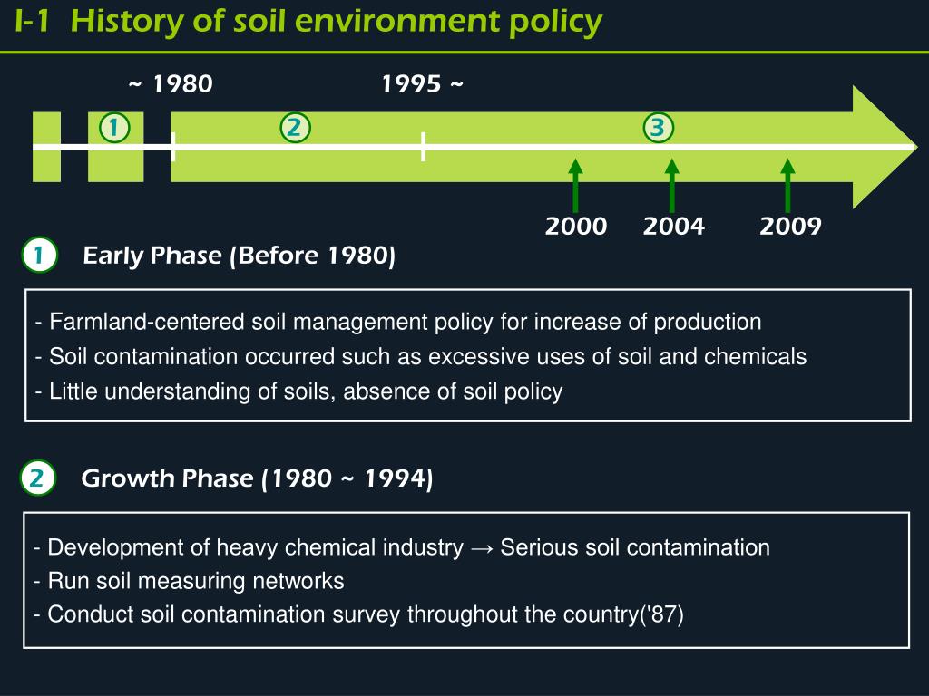 I-1 History of soil environment policy 1 2 3 1 2 1995 ~ ~ 1980 2000 2004 2009 Early Phase (Before 1980) - Farmland-centered soil management policy for increase of production - Soil contamination occurred such as excessive uses of soil and chemicals - Little understanding of soils, absence of soil policy Growth Phase (1980 ~ 1994) - Development of heavy chemical industry → Serious soil contamination • Run soil measuring networks • Conduct soil contamination survey throughout the country('87)