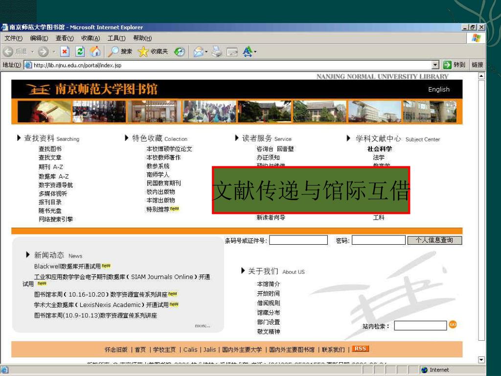 国内: ◆国家图书馆 ◆上海图书馆 ◆国家科技图书文献中心(nstl) ◆中国高等教育文献保障系统(China Academic Library & Information System,简称CALIS) ◆中国高校人文社会科学文献中心(China Academic Social Sciences and Humanities Library,简称CASHL) (我校参加使用后边两个系统,后面将分别加以介绍)