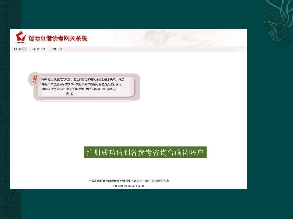 我馆的两个文献传递系统 • 中国高等教育文献保障系统(简称CALIS) • 中国高校人文社会科学文献中心(cashl)