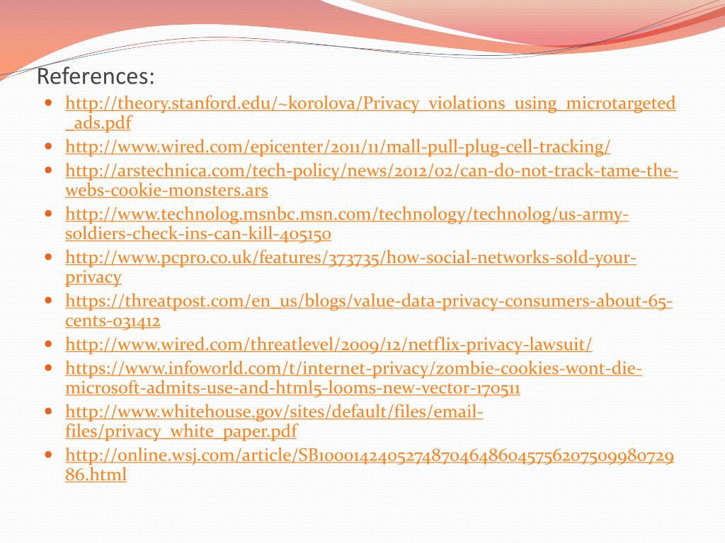 References: • http://theory.stanford.edu/~korolova/Privacy_violations_using_microtargeted_ads.pdf • http://www.wired.com/epicenter/2011/11/mall-pull-plug-cell-tracking/ • http://arstechnica.com/tech-policy/news/2012/02/can-do-not-track-tame-the-webs-cookie-monsters.ars • http://www.technolog.msnbc.msn.com/technology/technolog/us-army-soldiers-check-ins-can-kill-405150 • http://www.pcpro.co.uk/features/373735/how-social-networks-sold-your-privacy • https://threatpost.com/en_us/blogs/value-data-privacy-consumers-about-65-cents-031412 • http://www.wired.com/threatlevel/2009/12/netflix-privacy-lawsuit/ • https://www.infoworld.com/t/internet-privacy/zombie-cookies-wont-die-microsoft-admits-use-and-html5-looms-new-vector-170511 • http://www.whitehouse.gov/sites/default/files/email-files/privacy_white_paper.pdf • http://online.wsj.com/article/SB10001424052748704648604575620750998072986.html