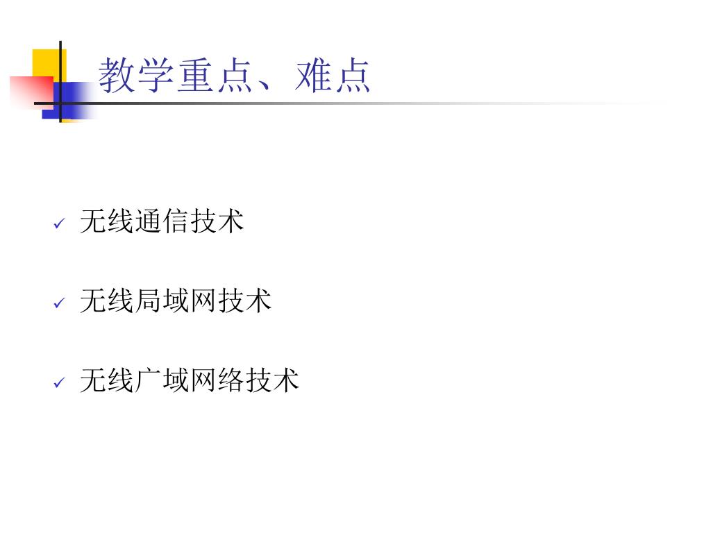 教学重点、难点 • 无线通信技术 • 无线局域网技术 • 无线广域网络技术
