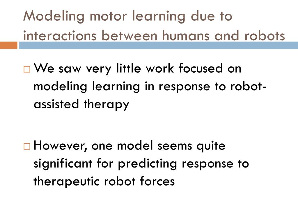 Modeling motor learning due to interactions between humans and robots • We saw very little work focused on modeling learning in response to robot-assisted therapy • However, one model seems quite significant for predicting response to therapeutic robot forces