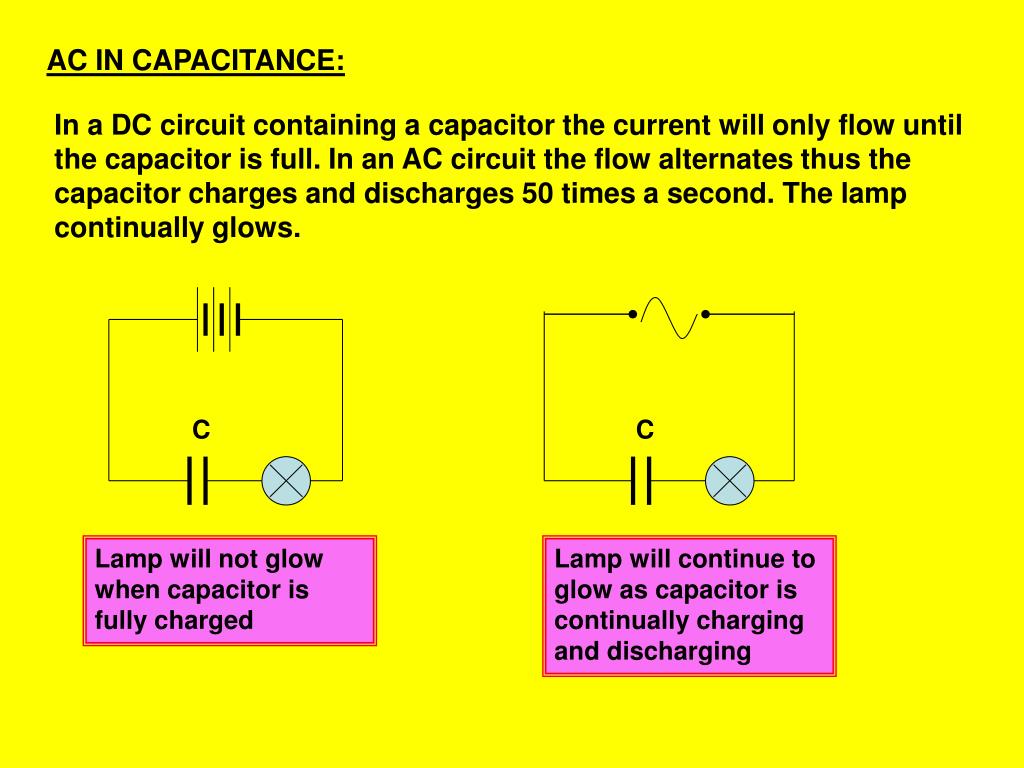AC IN CAPACITANCE: In a DC circuit containing a capacitor the current will only flow until the capacitor is full. In an AC circuit the flow alternates thus the capacitor charges and discharges 50 times a second. The lamp continually glows. C C Lamp will not glow when capacitor is fully charged Lamp will continue to glow as capacitor is continually charging and discharging
