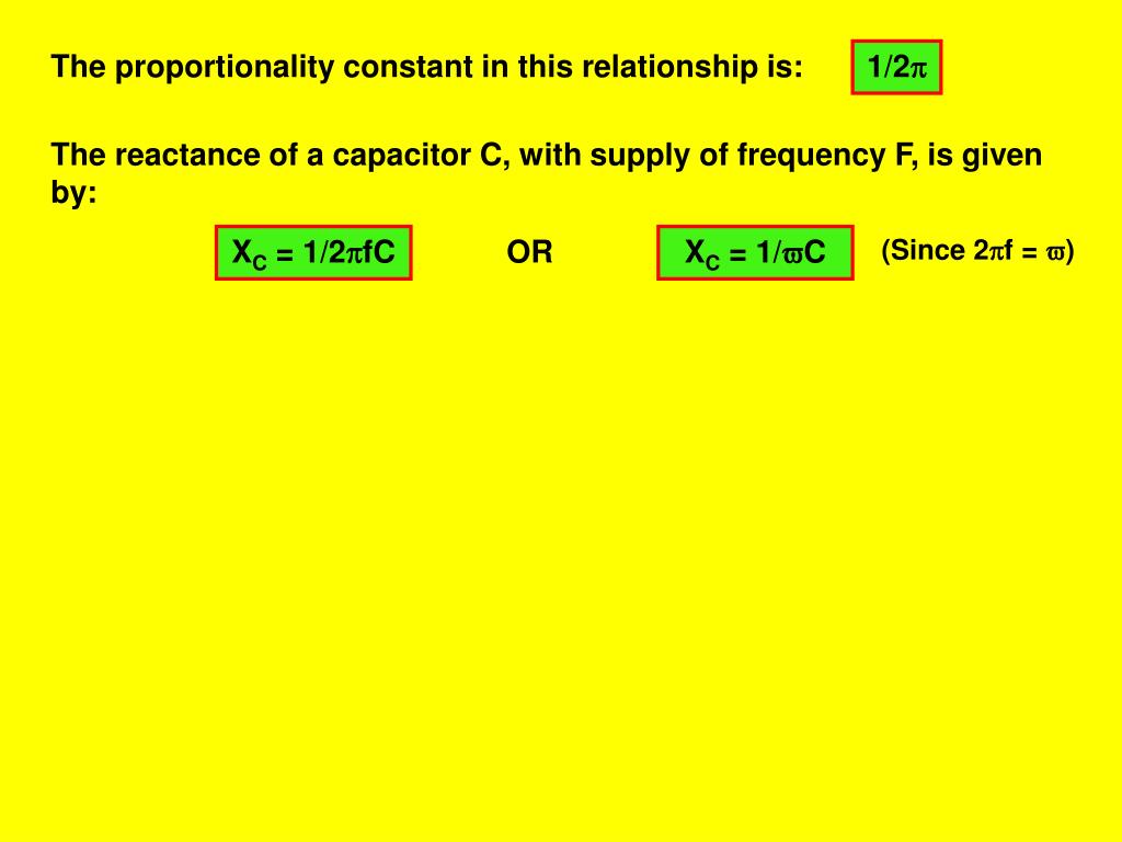 The proportionality constant in this relationship is: 1/2 The reactance of a capacitor C, with supply of frequency F, is given by: XC = 1/2fC OR XC = 1/C (Since 2f = )