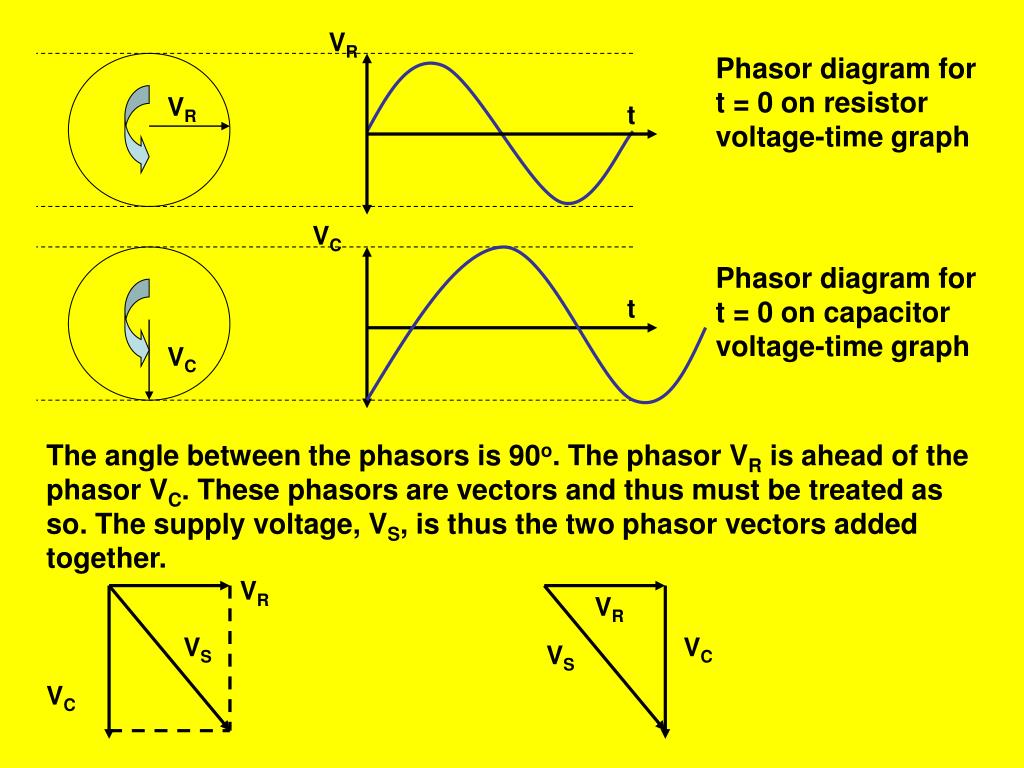 VR Phasor diagram for t = 0 on resistor voltage-time graph VR t VC Phasor diagram for t = 0 on capacitor voltage-time graph t VC The angle between the phasors is 90o. The phasor VR is ahead of the phasor VC. These phasors are vectors and thus must be treated as so. The supply voltage, VS, is thus the two phasor vectors added together. VR VR VS VC VS VC
