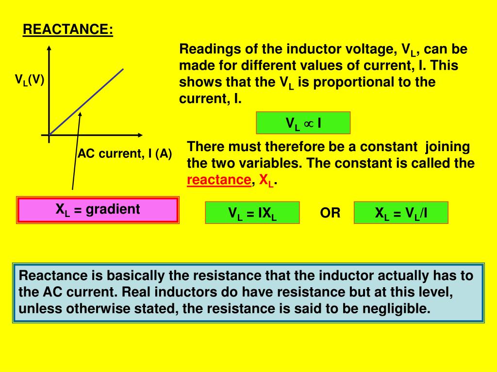 REACTANCE: Readings of the inductor voltage, VL, can be made for different values of current, I. This shows that the VL is proportional to the current, I. VL(V) VL I There must therefore be a constant joining the two variables. The constant is called the reactance, XL. AC current, I (A) XL = gradient VL= IXL OR XL= VL/I Reactance is basically the resistance that the inductor actually has to the AC current. Real inductors do have resistance but at this level, unless otherwise stated, the resistance is said to be negligible.