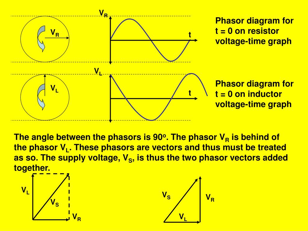 VR Phasor diagram for t = 0 on resistor voltage-time graph VR t VL Phasor diagram for t = 0 on inductor voltage-time graph VL t The angle between the phasors is 90o. The phasor VR is behind of the phasor VL. These phasors are vectors and thus must be treated as so. The supply voltage, VS, is thus the two phasor vectors added together. VL VS VR VS VR VL