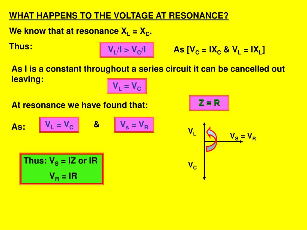 WHAT HAPPENS TO THE VOLTAGE AT RESONANCE? We know that at resonance XL = XC. Thus: VL/I > VC/I As [VC = IXC & VL = IXL] As I is a constant throughout a series circuit it can be cancelled out leaving: VL = VC Z = R At resonance we have found that: VL = VC & Vs = VR As: VL VS = VR Thus: VS = IZ or IR VR = IR VC