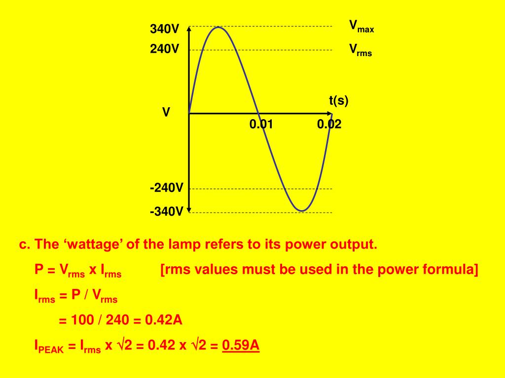 Vmax 340V 240V Vrms t(s) V 0.01 0.02 -240V -340V c. The ‘wattage’ of the lamp refers to its power output. P = Vrms x Irms [rms values must be used in the power formula] Irms = P / Vrms = 100 / 240 = 0.42A IPEAK = Irms x 2 = 0.42 x 2 = 0.59A