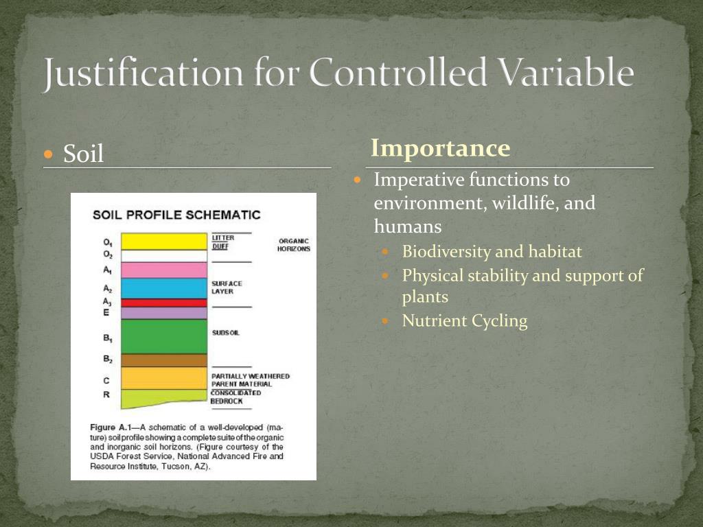 Justification for Controlled Variable Importance • Soil • Imperative functions to environment, wildlife, and humans • Biodiversity and habitat • Physical stability and support of plants • Nutrient Cycling