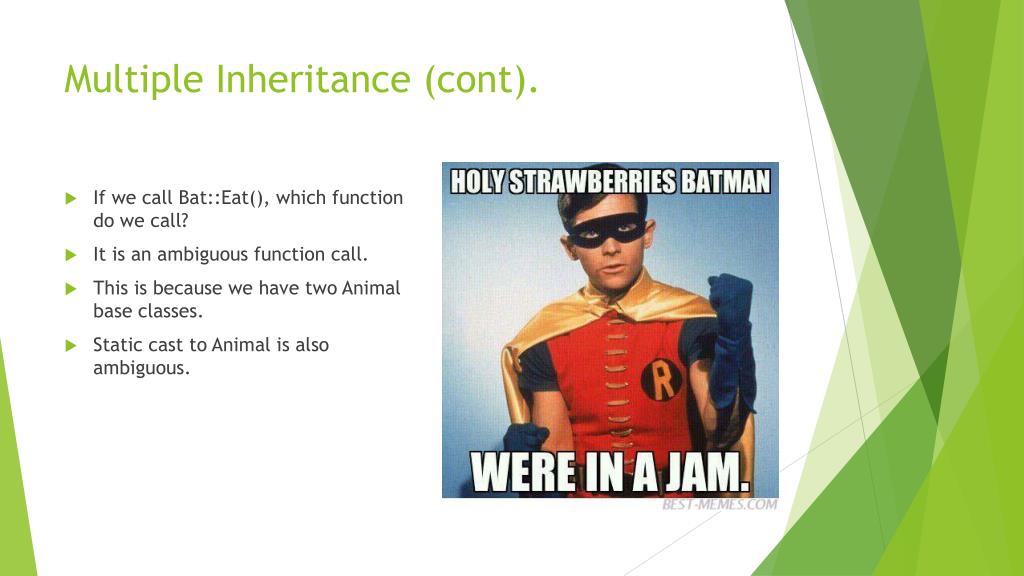 Multiple Inheritance (cont). • If we call Bat::Eat(), which function do we call? • It is an ambiguous function call. • This is because we have two Animal base classes. • Static cast to Animal is also ambiguous.