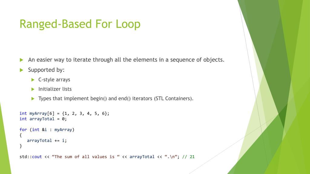 Ranged-Based For Loop • An easier way to iterate through all the elements in a sequence of objects. • Supported by: • C-style arrays • Initializer lists • Types that implement begin() and end() iterators (STL Containers). intmyArray[6] = {1, 2, 3, 4, 5, 6}; intarrayTotal = 0; for (int &i : myArray) { arrayTotal += i; } std::cout<< “The sum of all values is “ << arrayTotal << “.\n”; // 21