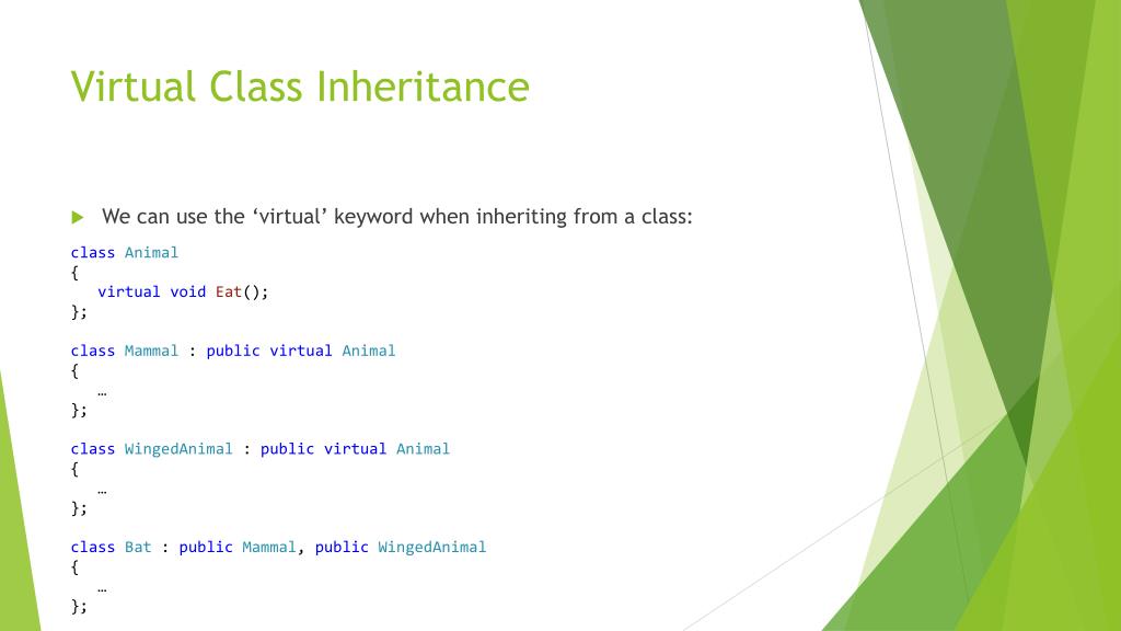 Virtual Class Inheritance • We can use the ‘virtual’ keyword when inheriting from a class: classAnimal { virtualvoidEat(); }; classMammal : publicvirtualAnimal { … }; classWingedAnimal: publicvirtualAnimal { … }; classBat : publicMammal, publicWingedAnimal { … };