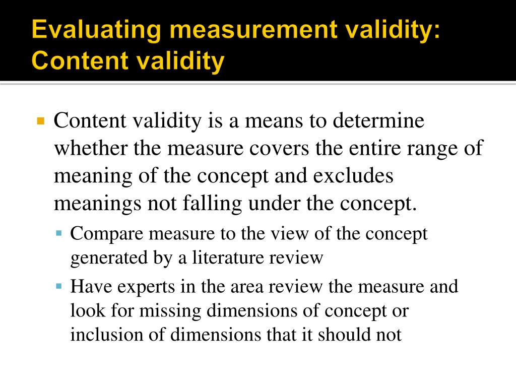 Evaluating measurement validity:Content validity • Content validity is a means to determine whether the measure covers the entire range of meaning of the concept and excludes meanings not falling under the concept. • Compare measure to the view of the concept generated by a literature review • Have experts in the area review the measure and look for missing dimensions of concept or inclusion of dimensions that it should not