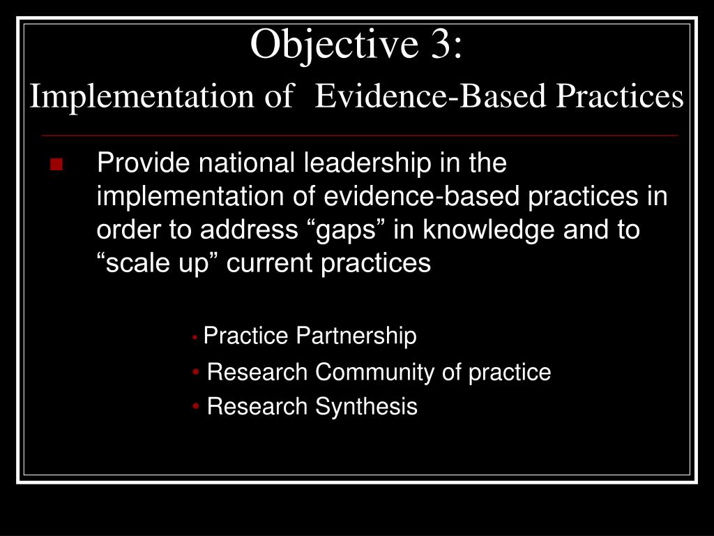 Objective 3:Implementation of Evidence-Based Practices • Provide national leadership in the implementation of evidence-based practices in order to address “gaps” in knowledge and to “scale up” current practices •Practice Partnership • Research Community of practice • Research Synthesis
