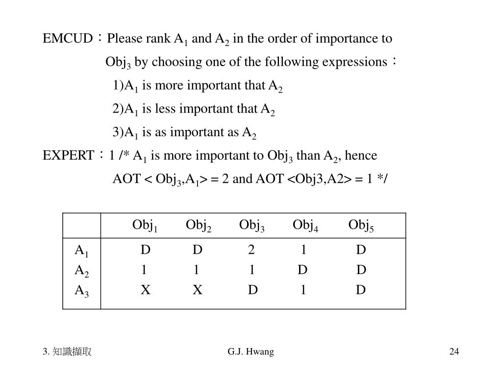 An example of constructing AOT. EMCUD:If A1 {9,10,12}, is it possible that GOAL =Obj1 ? EXPERT:No. /*This implies that A1 dominates Obj1 and AOT<Obj1,A1> = ‘D’ */ EMCUD:If A2 YES,is it possible that GOAL = Obj1? EXPERT:Yes. /*A2 does not dominate Obj1 */ EMCUD:If A1 > 16 or A1 13, is it possible that GOAL = Obj3? EXPERT:Yes. /* A1 does not dominate Obj3 */ EMCUD:If A2 YES, is it possible that GOAL = Obj3 ? EXPERT:Yes. /* A2 does not dominate Obj3 */ EMCUD:If A3 4.3 , is it possible that GOAL = Obj3 ? EXPERT:No. /* A3 does dominate Obj3 */ G.J. Hwang