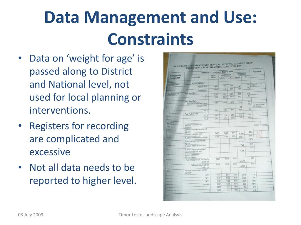 Data Management and Use:Constraints • Data on ‘weight for age’ is passed along to District and National level, not used for local planning or interventions. • Registers for recording are complicated and excessive • Not all data needs to be reported to higher level. Timor Leste Landscape Analsyis