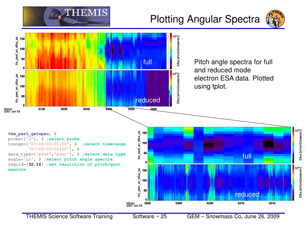 Plotting Angular Spectra full Pitch angle spectra for full and reduced mode electron ESA data. Plotted using tplot. reduced thm_part_getspec, $ probe=['c'], $ ;select probe trange=['07-06-03/01:08', $ ;select timerange '07-06-03/04:20'], $ data_type=['peef','peer'], $ ;select data type angle='pa', $ ;select pitch angle spectra regrid=[32,16] ;set resolution of pitch/gyrospectra full reduced
