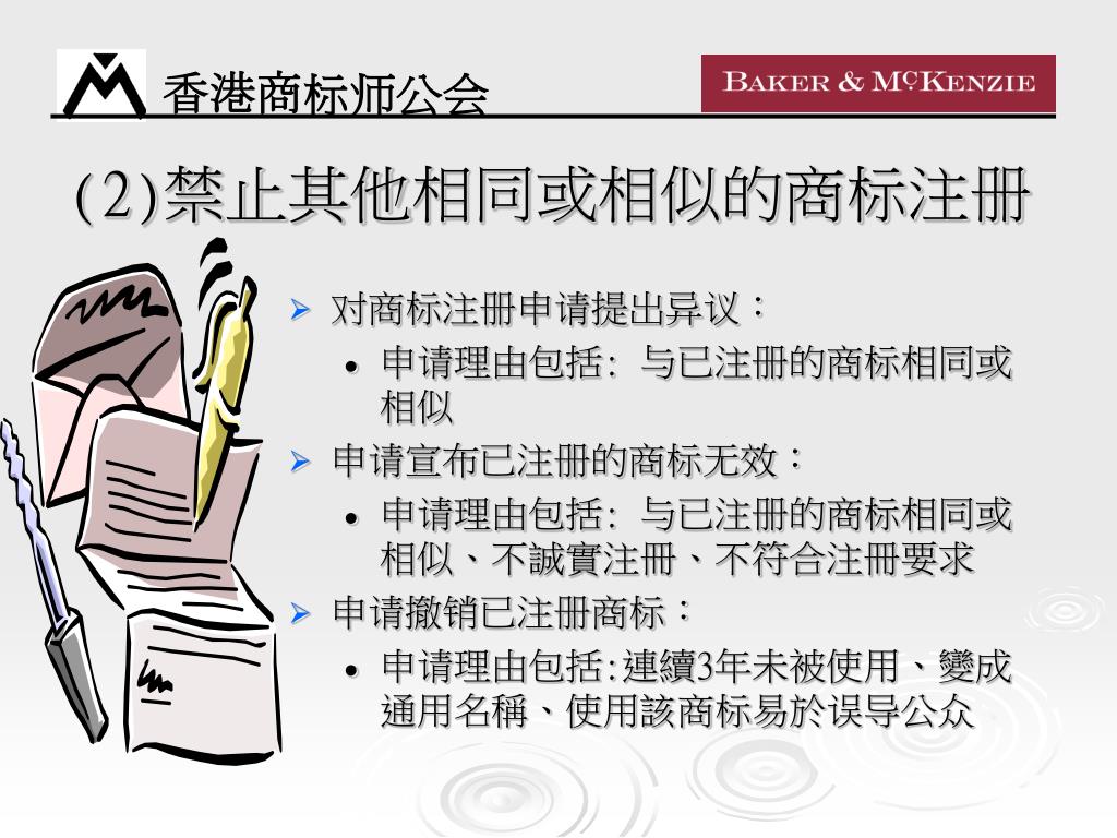 (2)禁止其他相同或相似的商标注册 • 对商标注册申请提出异议: • 申请理由包括: 与已注册的商标相同或相似 • 申请宣布已注册的商标无效: • 申请理由包括: 与已注册的商标相同或相似、不誠實注冊、不符合注冊要求 • 申请撤销已注册商标: • 申请理由包括:連續3年未被使用、變成通用名稱、使用該商标易於误导公众