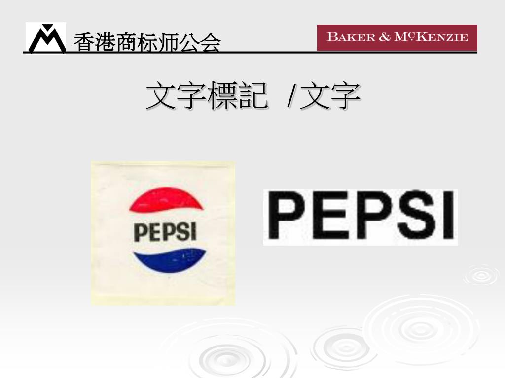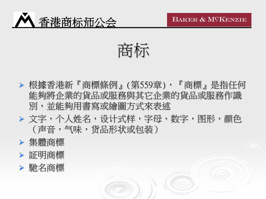 商标 • 根據香港新『商標條例』(第559章),『商標』是指任何能夠將企業的貨品或服務與其它企業的貨品或服務作識別,並能夠用書寫或繪圖方式來表述 • 文字,个人姓名,设计式样,字母,数字,图形,颜色(声音,气味,货品形状或包装) • 集體商標 • 証明商標 • 馳名商標