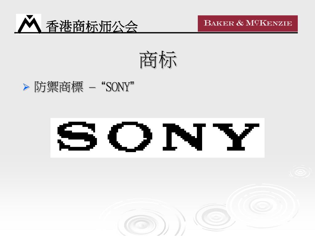 香港商标师公会 . 香港特區 注册商标赋予的权益 及 法律專業服务 张吕宝儿. 商标. 根據香港新『商標條例』(第559章),『商標』是指任何能夠將企業的貨品或服務與其它企業的貨品或服務作識別,並能夠用書寫或繪圖方式來表述 文字,个人姓名,设计式样,字母,数字,图形,颜色(声音,气味,货品形状或包装) 集體商標 証明商標 馳名商標. 文字標記 /文字. 字母標記. 圖形. 聲音. 形狀. 商标. 防禦商標 – “ SONY ”. 不可注册的商标. 絕對理由 1. 除非能夠通過使用而獲得顯著性的商標,以下的不能注冊為商標:
