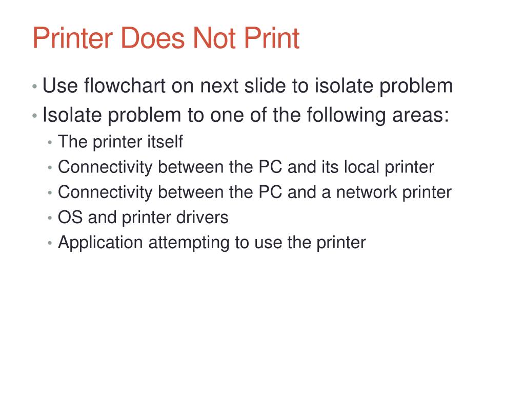 Printer Does Not Print • Use flowchart on next slide to isolate problem • Isolate problem to one of the following areas: • The printer itself • Connectivity between the PC and its local printer • Connectivity between the PC and a network printer • OS and printer drivers • Application attempting to use the printer
