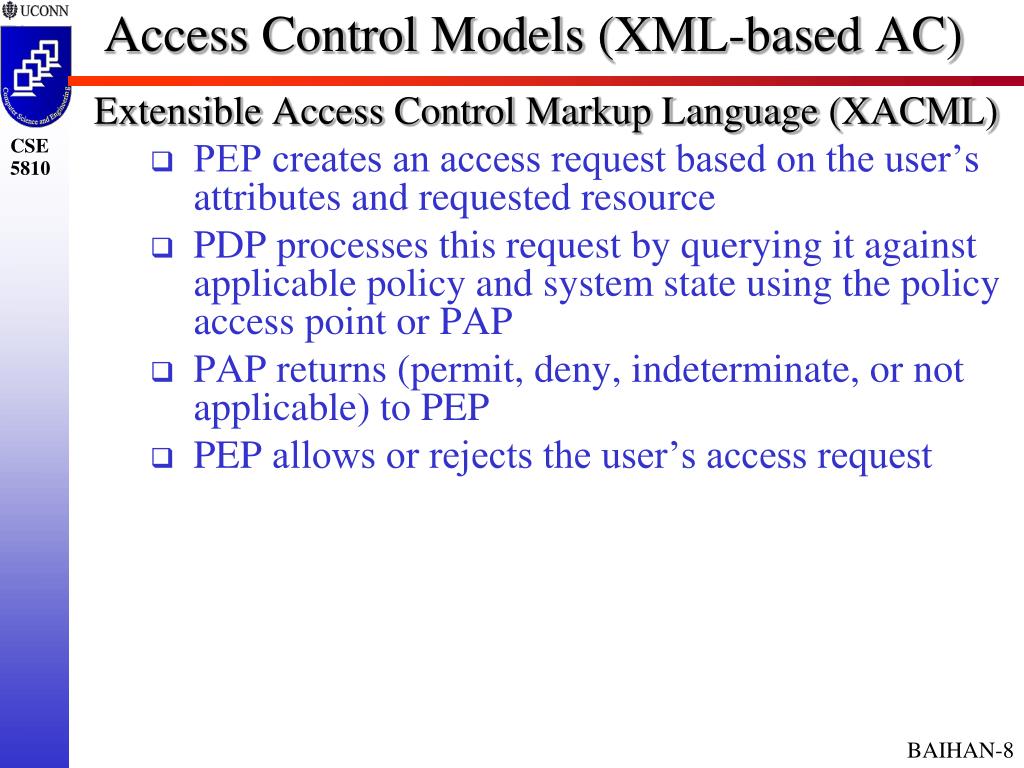 Access Control Models (XML-based AC) Extensible Access Control Markup Language (XACML) • PEP creates an access request based on the user’s attributes and requested resource • PDP processes this request by querying it against applicable policy and system state using the policy access point or PAP • PAP returns (permit, deny, indeterminate, or not applicable) to PEP • PEP allows or rejects the user’s access request