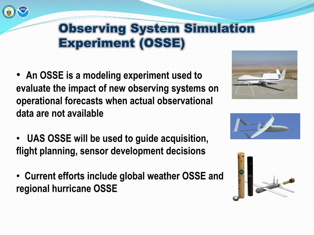 Observing System Simulation Experiment (OSSE) • An OSSE is a modeling experiment used to evaluate the impact of new observing systems on operational forecasts when actual observational data are not available • UAS OSSE will be used to guide acquisition, flight planning, sensor development decisions • Current efforts include global weather OSSE and regional hurricane OSSE
