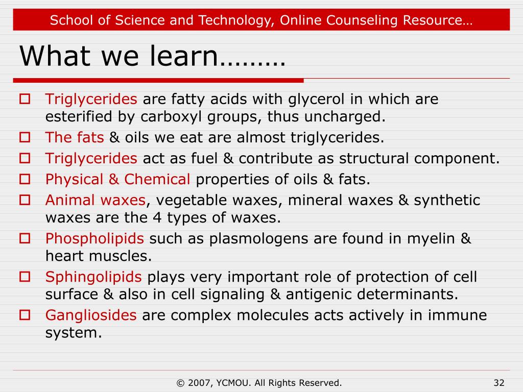 Learning Objectives • After studying this module, you should be able to: • Discuss the triglycerides with their structure & function. • Describe physical properties & uses of oils & fats. • Describe the types of waxes & its sources. • Define phospholipids , glycolipids. • Discuss various phospholipids such as gangliosides, plasmologens, sphingolipids with their structures & functions. • Describe the disorders cause due to excess or depletion or failure metabolism of all these lipids. © 2007, YCMOU. All Rights Reserved.