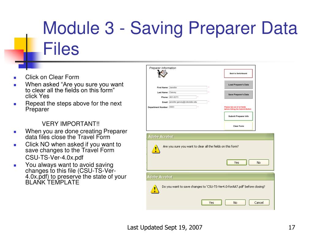 Module 3 - Saving Preparer Data Files • Click on Clear Form • When asked “Are you sure you want to clear all the fields on this form” click Yes • Repeat the steps above for the next Preparer VERY IMPORTANT!! • When you are done creating Preparer data files close the Travel Form • Click NO when asked if you want to save changes to the Travel Form CSU-TS-Ver-4.0x.pdf • You always want to avoid saving changes to this file (CSU-TS-Ver-4.0x.pdf) to preserve the state of your BLANK TEMPLATE Last Updated Sept 19, 2007