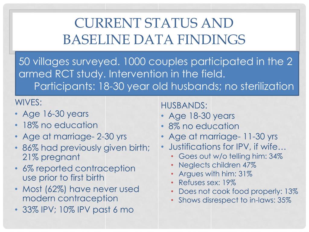 Current status and Baseline data findings • 50 villages surveyed. 1000 couples participated in the 2 armed RCT study. Intervention in the field. • Participants: 18-30 year old husbands; no sterilization WIVES: • Age 16-30 years • 18% no education • Age at marriage- 2-30 yrs • 86% had previously given birth; 21% pregnant • 6% reported contraception use prior to first birth • Most (62%) have never used modern contraception • 33% IPV; 10% IPV past 6 mo HUSBANDS: • Age 18-30 years • 8% no education • Age at marriage- 11-30 yrs • Justifications for IPV, if wife… • Goes out w/o telling him: 34% • Neglects children 47% • Argues with him: 31% • Refuses sex: 19% • Does not cook food properly: 13% • Shows disrespect to in-laws: 35%