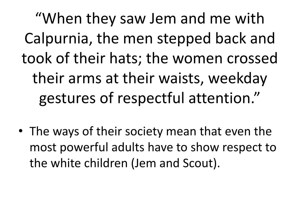 “When they saw Jem and me with Calpurnia, the men stepped back and took of their hats; the women crossed their arms at their waists, weekday gestures of respectful attention.” • The ways of their society mean that even the most powerful adults have to show respect to the white children (Jem and Scout).