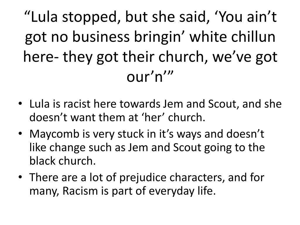 “Lula stopped, but she said, ‘You ain’t got no business bringin’ white chillun here- they got their church, we’ve got our’n’” • Lula is racist here towards Jem and Scout, and she doesn’t want them at ‘her’ church. • Maycomb is very stuck in it’s ways and doesn’t like change such as Jem and Scout going to the black church. • There are a lot of prejudice characters, and for many, Racism is part of everyday life.