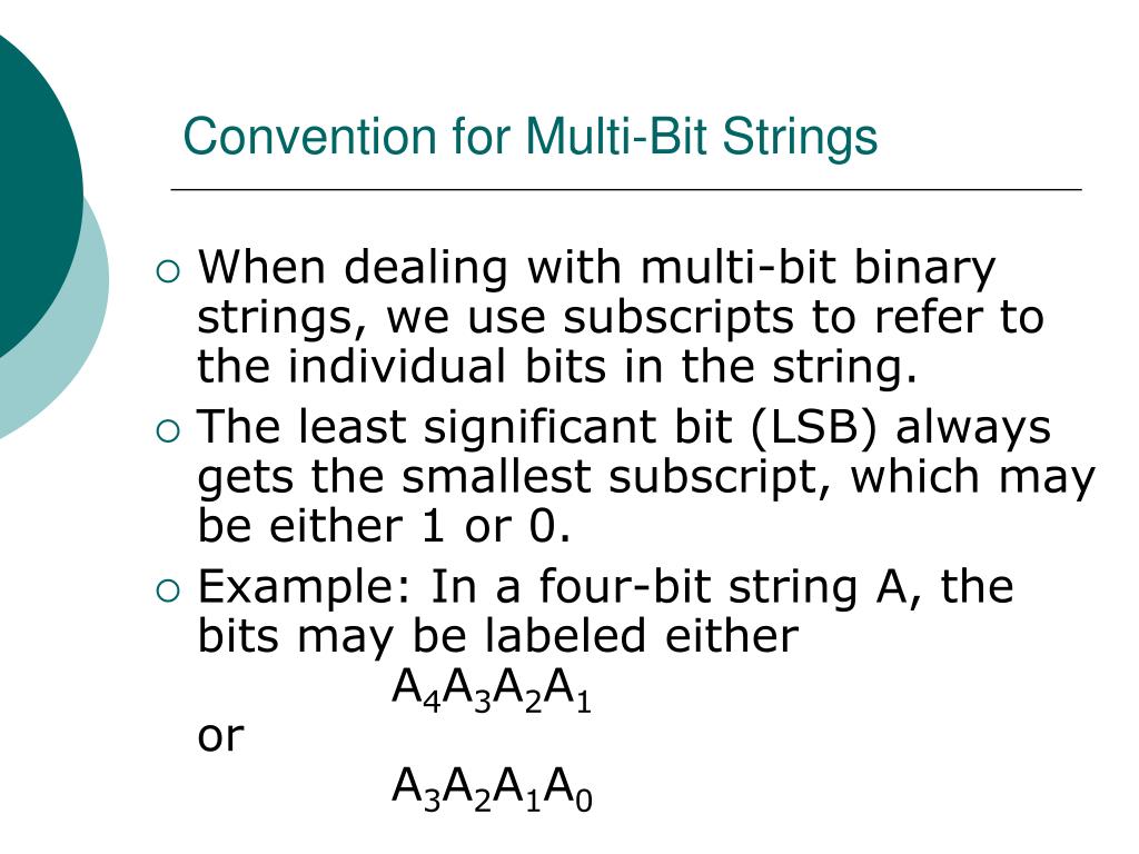 Convention for Multi-Bit Strings When dealing with multi-bit binary strings, we use subscripts to refer to the individual bits in the string. The least significant bit (LSB) always gets the smallest subscript, which may be either 1 or 0. Example: In a four-bit string A, the bits may be labeled either A4A3A2A1or A3A2A1A0