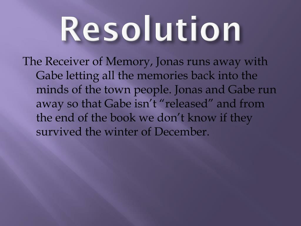 Resolution The Receiver of Memory, Jonas runs away with Gabe letting all the memories back into the minds of the town people. Jonas and Gabe run away so that Gabe isn’t “released” and from the end of the book we don’t know if they survived the winter of December.