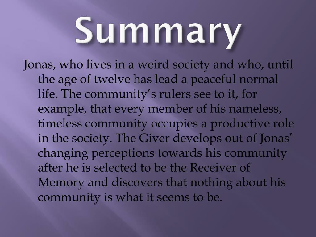 Summary Jonas, who lives in a weird society and who, until the age of twelve has lead a peaceful normal life. The community’s rulers see to it, for example, that every member of his nameless, timeless community occupies a productive role in the society. The Giver develops out of Jonas’ changing perceptions towards his community after he is selected to be the Receiver of Memory and discovers that nothing about his community is what it seems to be.