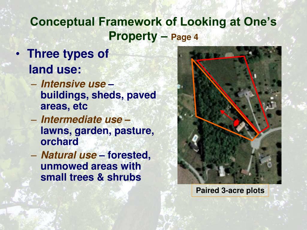 Conceptual Framework of Looking at One’s Property – Page 4 • Three types of land use: • Intensive use – buildings, sheds, paved areas, etc • Intermediate use – lawns, garden, pasture, orchard • Natural use – forested, unmowed areas with small trees & shrubs Paired 3-acre plots