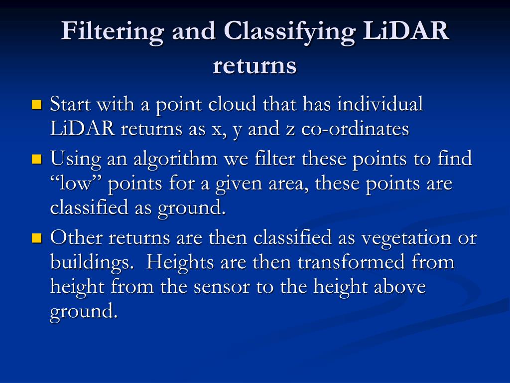 Filtering LiDAR returns • “Point cloud” that has individual LiDAR returns as x, y and z co-ordinates