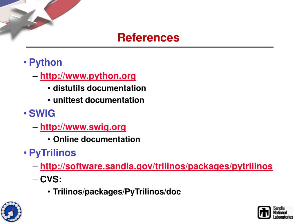 References • Python • http://www.python.org • distutils documentation • unittest documentation • SWIG • http://www.swig.org • Online documentation • PyTrilinos • http://software.sandia.gov/trilinos/packages/pytrilinos • CVS: • Trilinos/packages/PyTrilinos/doc