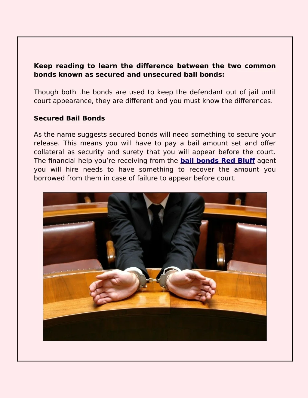 Keep reading to learn the difference between the two common bonds known as secured and unsecured bail bonds: Though both the bonds are used to keep the defendant out of jail until court appearance, they are different and you must know the differences. Secured Bail Bonds As the name suggests secured bonds will need something to secure your release. This means you will have to pay a bail amount set and offer collateral as security and surety that you will appear before the court. The financial help you’re receiving from the bail bonds Red Bluff agent you will hire needs to have something to recover the amount you borrowed from them in case of failure to appear before court.