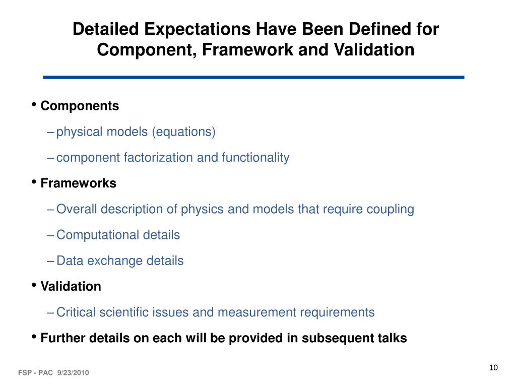 Detailed Expectations Have Been Defined for Component, Framework and Validation • Components • physical models (equations) • component factorization and functionality • Frameworks • Overall description of physics and models that require coupling • Computational details • Data exchange details • Validation • Critical scientific issues and measurement requirements • Further details on each will be provided in subsequent talks FSP - PAC 9/23/2010