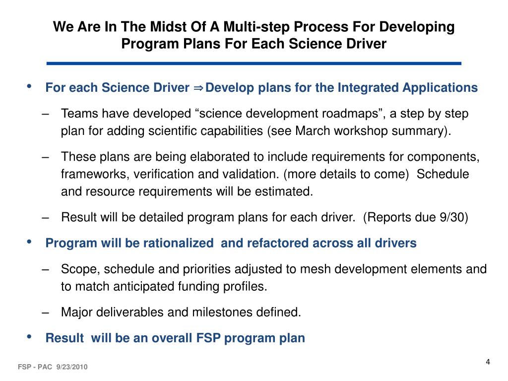 We Are In The Midst Of A Multi-step Process For Developing Program Plans For Each Science Driver • For each Science Driver ⇒ Develop plans for the Integrated Applications • Teams have developed “science development roadmaps”, a step by step plan for adding scientific capabilities (see March workshop summary). • These plans are being elaborated to include requirements for components, frameworks, verification and validation. (more details to come)Schedule and resource requirements will be estimated. • Result will be detailed program plans for each driver. (Reports due 9/30) • Program will be rationalized and refactored across all drivers • Scope, schedule and priorities adjusted to mesh development elements and to match anticipated funding profiles. • Major deliverables and milestones defined. • Result will be an overall FSP program plan FSP - PAC 9/23/2010