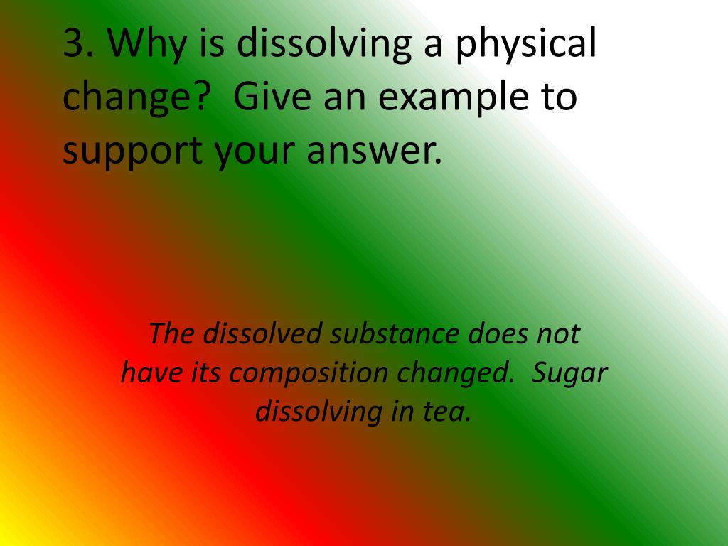 3. Why is dissolving a physical change? Give an example to support your answer. The dissolved substance does not have its composition changed. Sugar dissolving in tea.