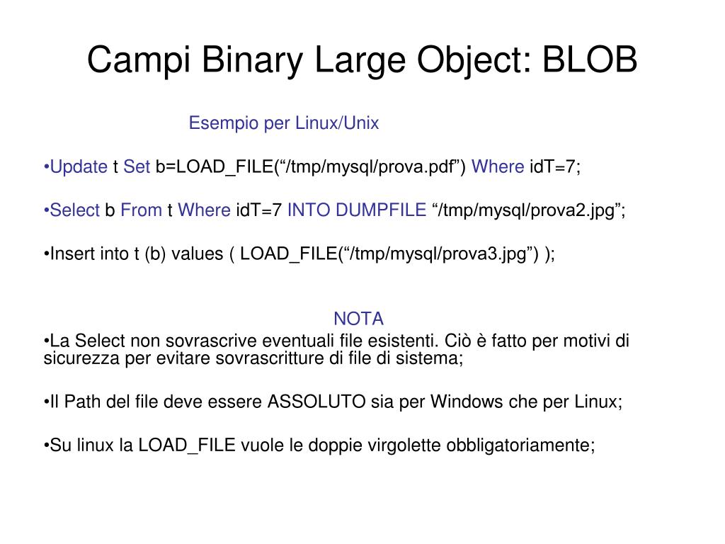 Campi Binary Large Object: BLOB Esempio per Linux/Unix • Update t Set b=LOAD_FILE(“/tmp/mysql/prova.pdf”) Where idT=7; • Select b From t Where idT=7 INTO DUMPFILE “/tmp/mysql/prova2.jpg”; • Insert into t (b) values ( LOAD_FILE(“/tmp/mysql/prova3.jpg”) ); NOTA • La Select non sovrascrive eventuali file esistenti. Ciò è fatto per motivi di sicurezza per evitare sovrascritture di file di sistema; • Il Path del file deve essere ASSOLUTO sia per Windows che per Linux; • Su linux la LOAD_FILE vuole le doppie virgolette obbligatoriamente;