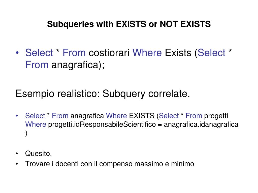 Subqueries with EXISTS or NOT EXISTS • Select * From costiorari Where Exists (Select * From anagrafica); Esempio realistico: Subquery correlate. • Select * From anagrafica Where EXISTS (Select * From progetti Where progetti.idResponsabileScientifico = anagrafica.idanagrafica ) • Quesito. • Trovare i docenti con il compenso massimo e minimo